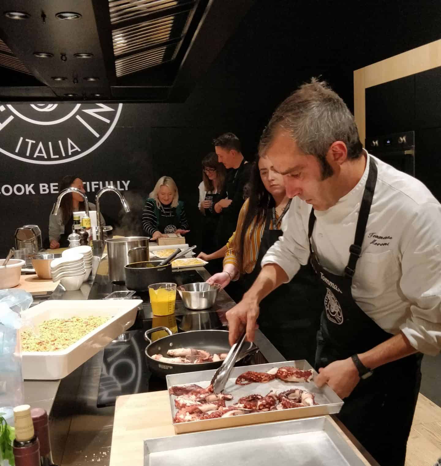 A cooking experience at Casa Bertazzoni. Chef Tomasso preparing the meal.