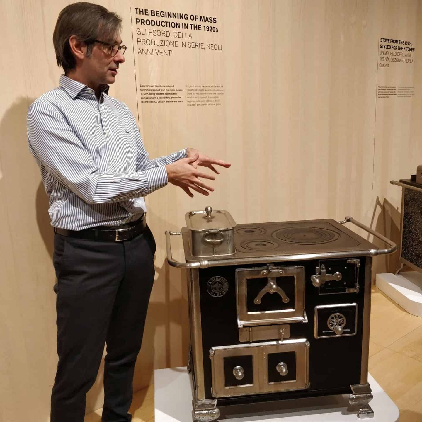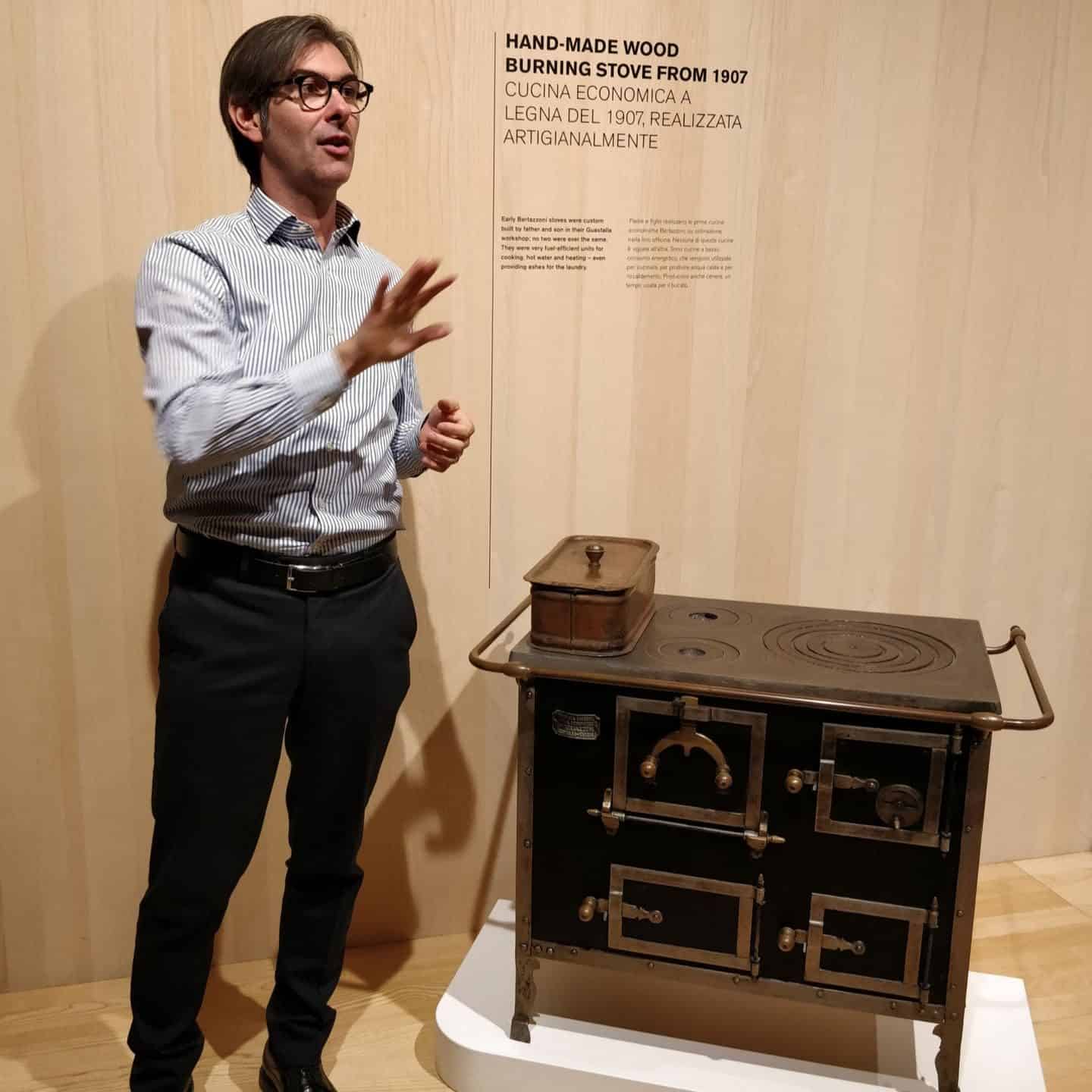 Nicola Bertazzoni showing the wood-burning stove used in the trains The first mass-produced wood burning stove used for home cooking