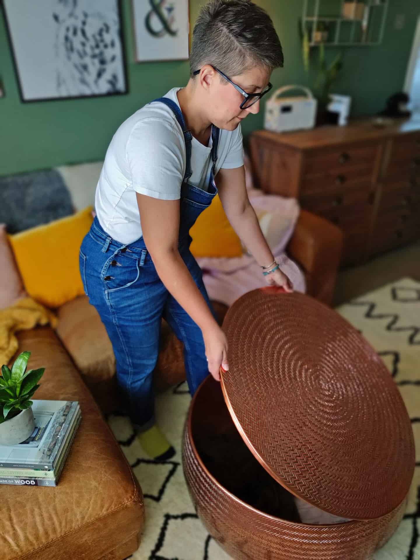 It’s only 70cm diameter so it’s the perfect size for a small living room. The removable lid for storage provides a great hiding place for extra throws that we don’t necessarily want to have on display. Although storage furniture is also great for stowing away kids toys and other paraphernalia.