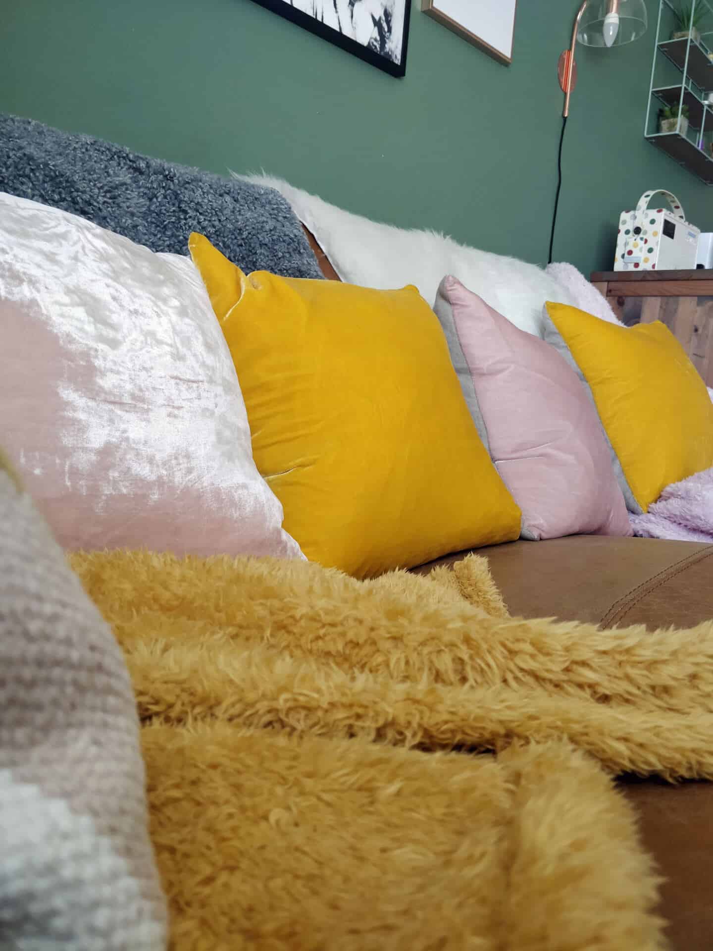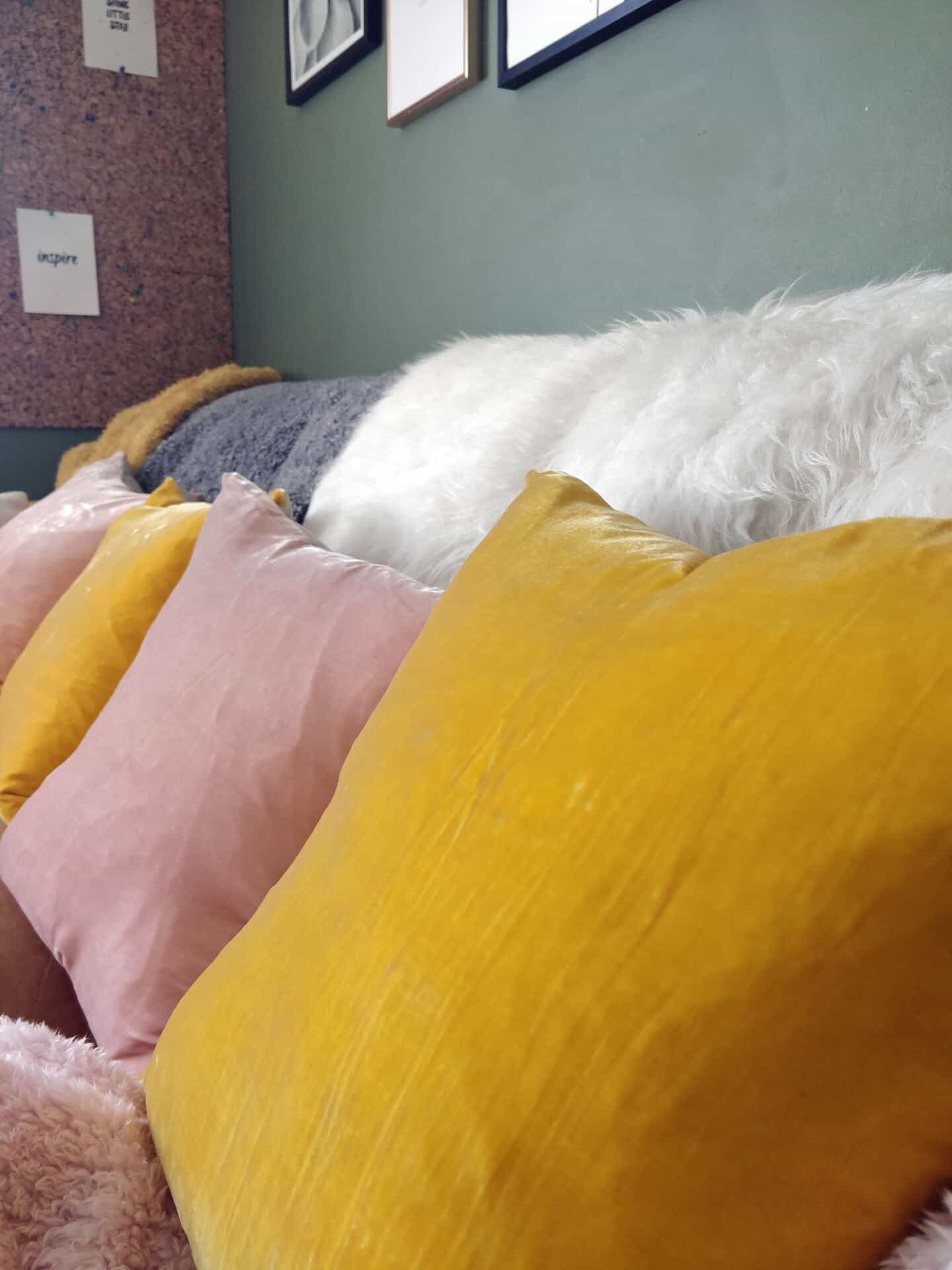 I adore the colour combination of the dusty pink and mustard yellow with the moss green. It gives me a real sense of harmony and calm but in a happy and energizing way. I opted for the Regency cushions which come in pairs for £50, which I thought was an absolute steal. They are soft plush velvet on the front with a 100% linen fabric on the back and they come with feather filled pads. This was really important for me as I need to be able to plump them up and reshape them after my husband and kids have squished them out of shape.