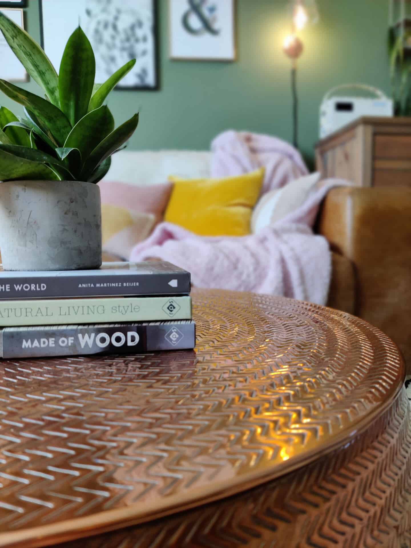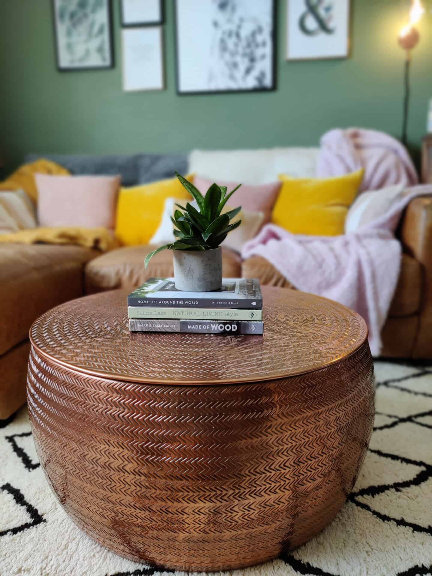 I decided that a round coffee table would be a much better option, but I really struggled to find one that was the right size. It seems that the standard size for round coffee tables is 80cm diameter and this was larger than I wanted to go. But it was a real mission to find something smaller. That was until I happened upon the Sona coffee table. It’s made from hammered aluminium and is a beautiful rose gold colour with a hand-etched design.
