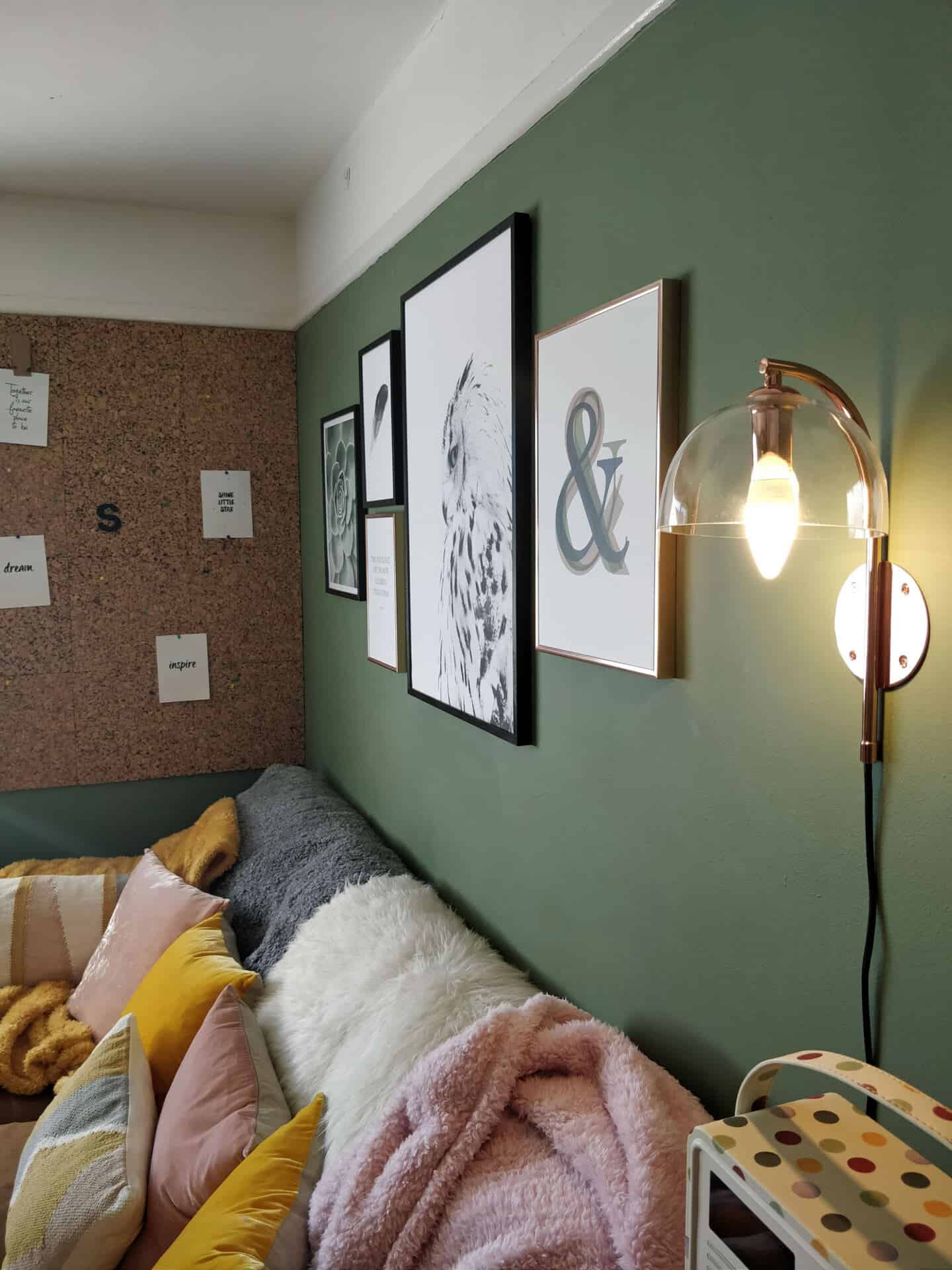 I specifically wanted wall lights, because in a small room it’s important not to clutter up surfaces. So I didn’t want another table lamp. But I also really didn’t want to have to get an electrician involved to install wall lighting. I’d been looking around for wall lights that could be plugged in but I wanted something quite subtle that wouldn’t take up too much visual space and preferably with copper accents. When I found the Ivar light, I knew it was the perfect option. I love the shiny copper and how it ties in so nicely with the coffee table and the copper picture frames. And the glass shade is just so understated.
