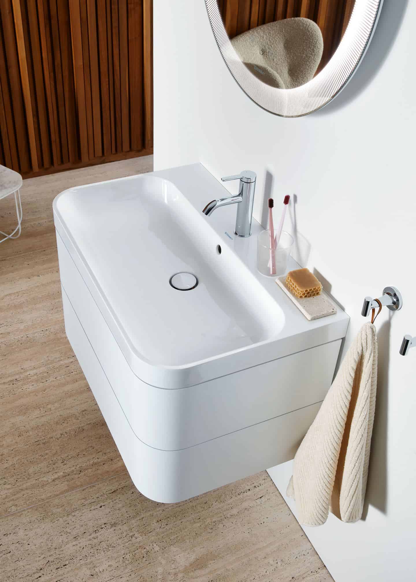 Duravit Happy D.2 Plus c-shaped is an evolution of the patented c-bonded technology that enables the practically seamless connection of rounded ceramics with matching bathroom furniture.