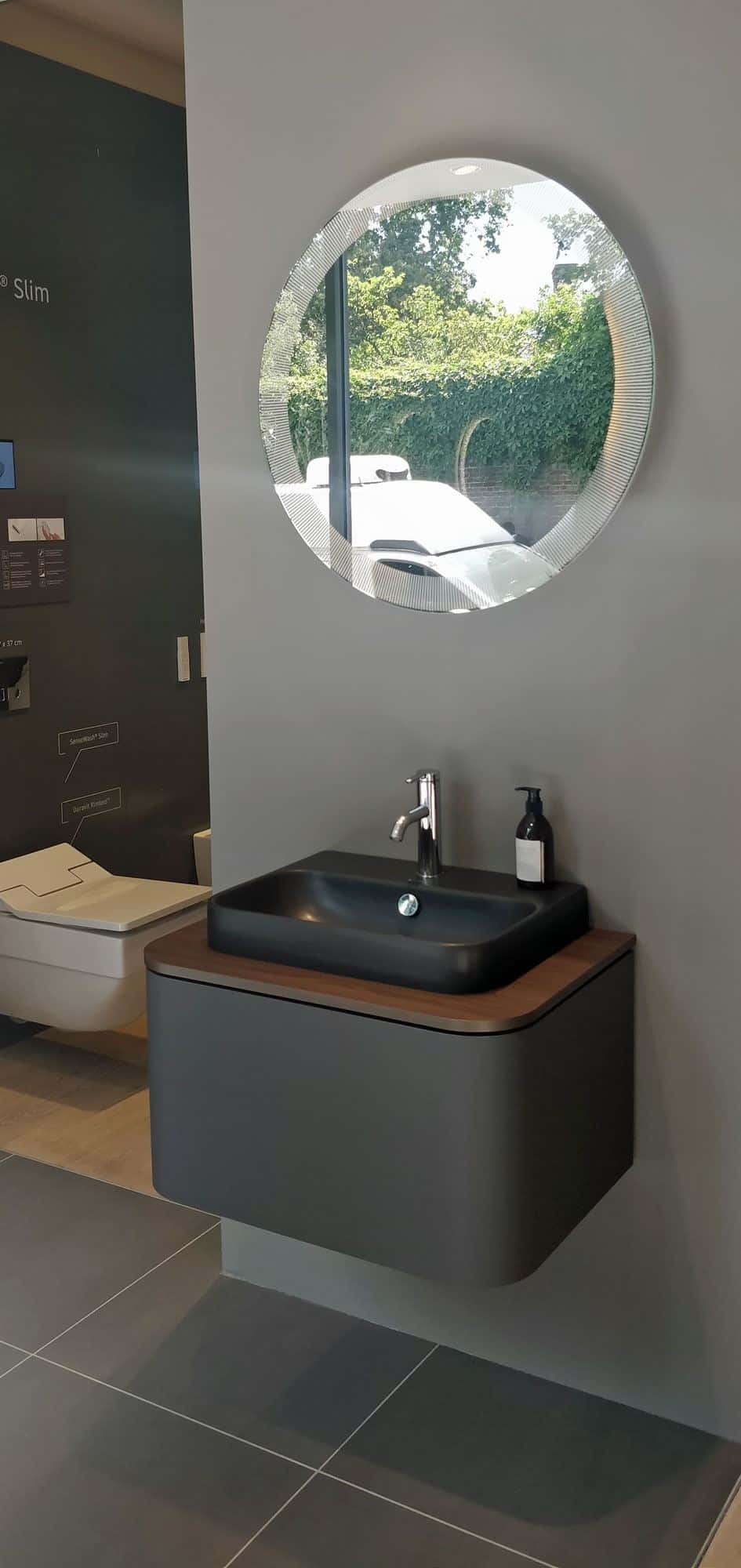 The range features above-counter basins, stand-alone consoles and matching tall and semi-tall cabinets as well as circular mirrors. The mirrors can be operated as individual components or they can be synchronised so that they can be controlled by one unit.