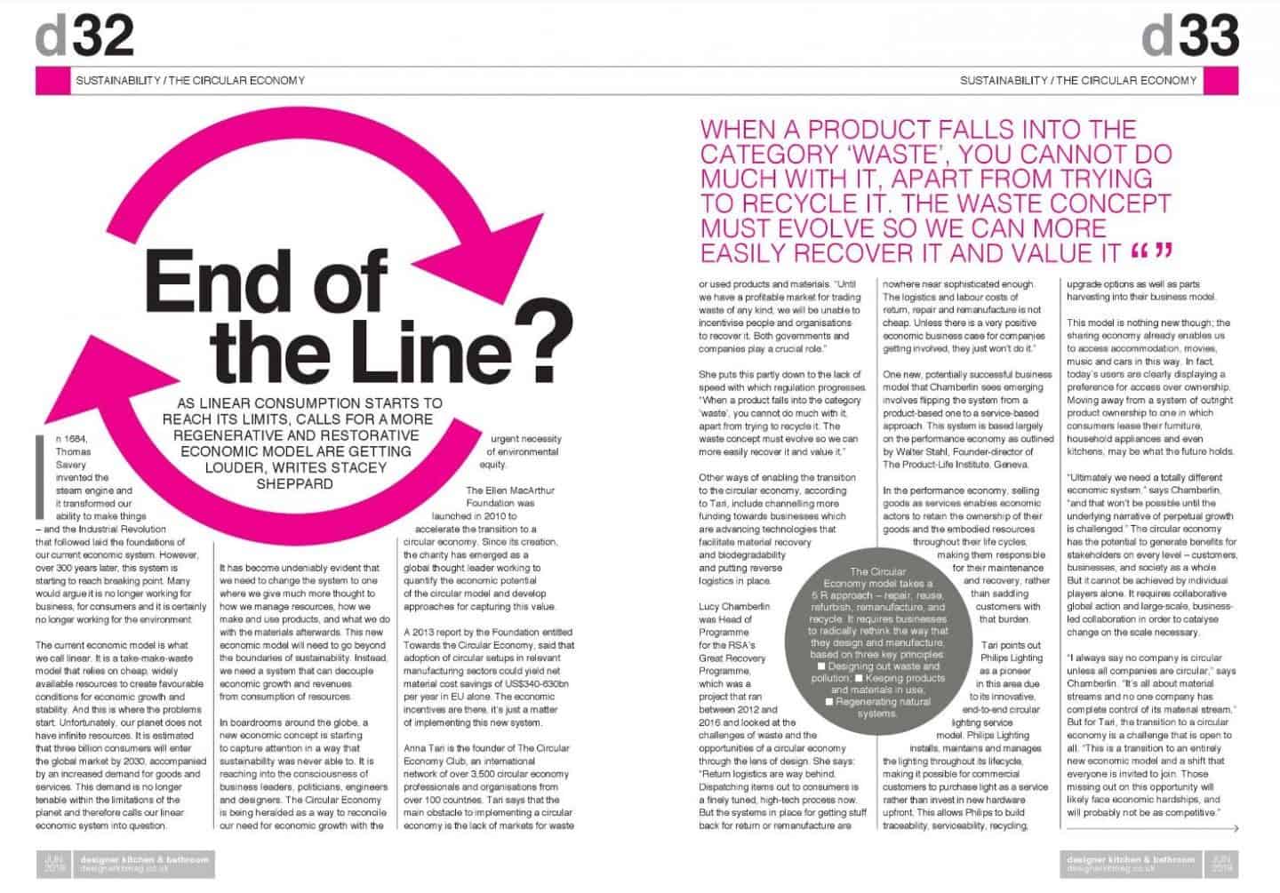 In June, an article I wrote about the Circular Economy appeared in Designer Kitchen & Bathroom magazine. In it, I explored the need for a transition away from a linear economic model that relies on cheap, widely available resources to create favourable conditions for economic growth and stability. I examined the need to move towards a more circular model that can decouple economic growth and revenues from consumption of resources.