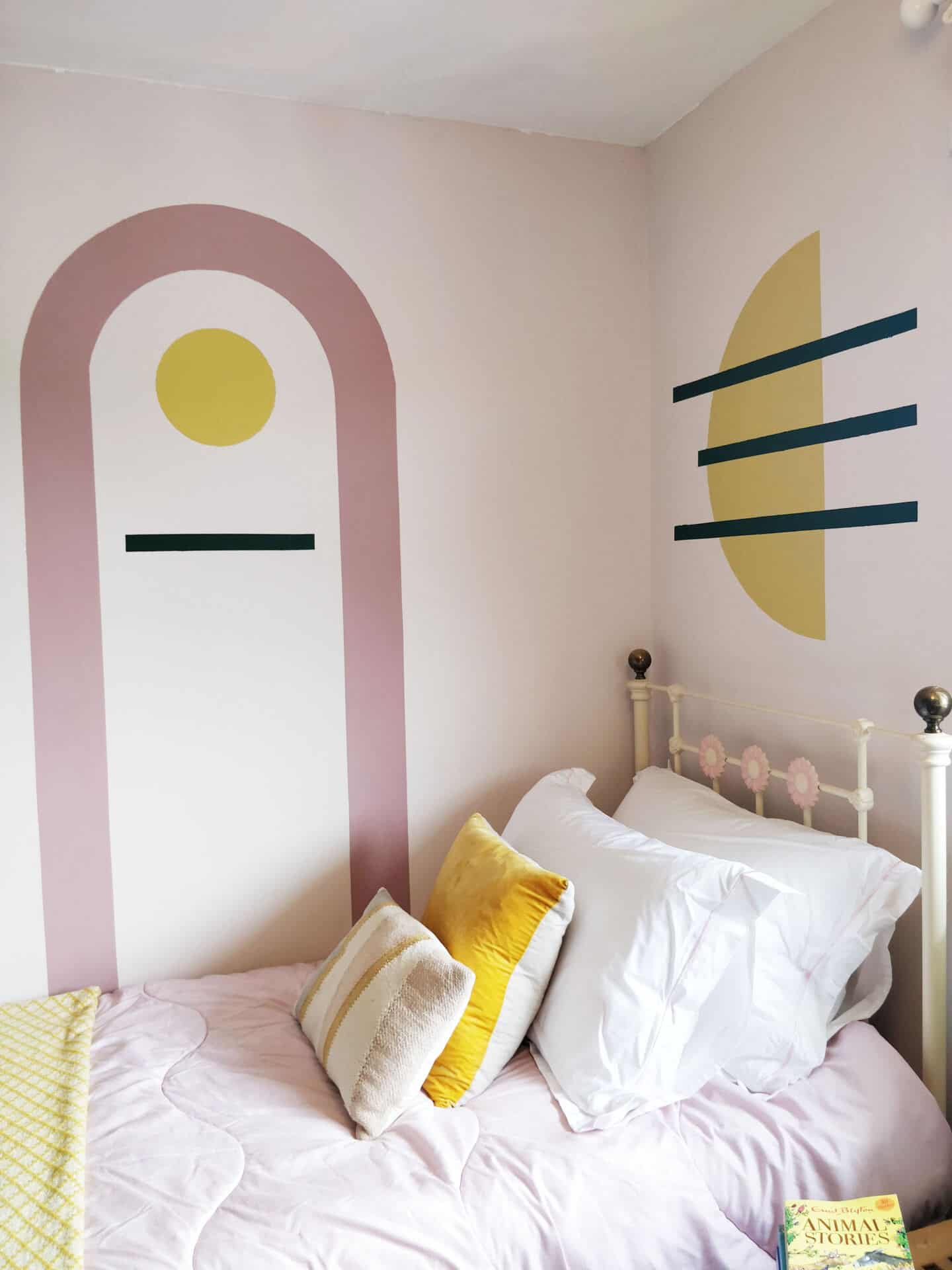 Once I had measured out the design by drawing little marks all over the wall, I then had to join them up so that I could see what I was going to paint. My youngest daughter is pretty keen on rainbows. She loves lots of colour and sparkles. My eldest daughter however, is much more subdued and prefers a more sophisticated colour palette and design. So we decided to go for some on-trend arches (as a nod to a rainbow) with a few geometric additions to add some extra interest and colour to the room.