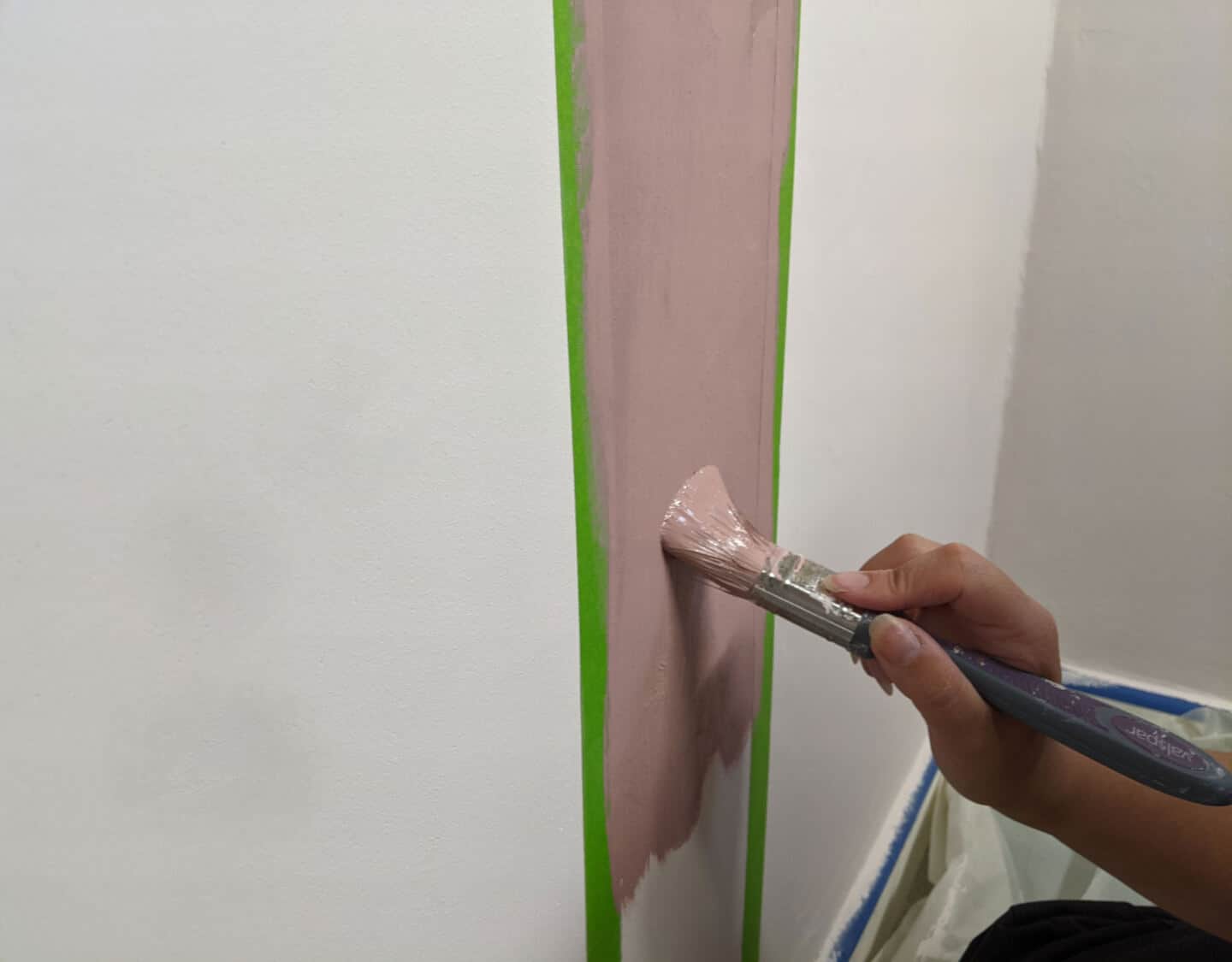 The next step in the process of creating your DIY painted arch accent wall is to paint the shapes that you have just taped up. Take it slowly, making sure you get really good coverage along the tape edge and try to make sure your brush strokes go in the same direction.