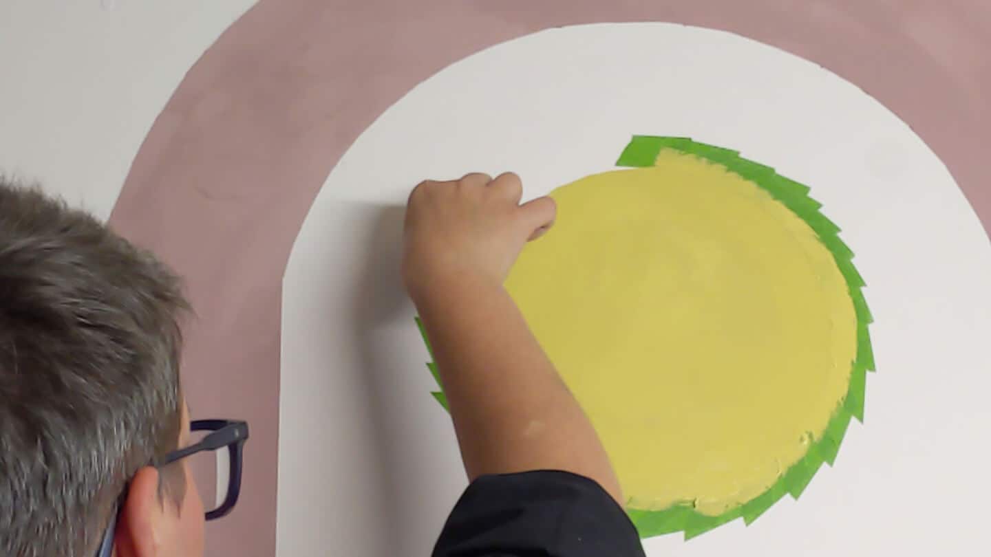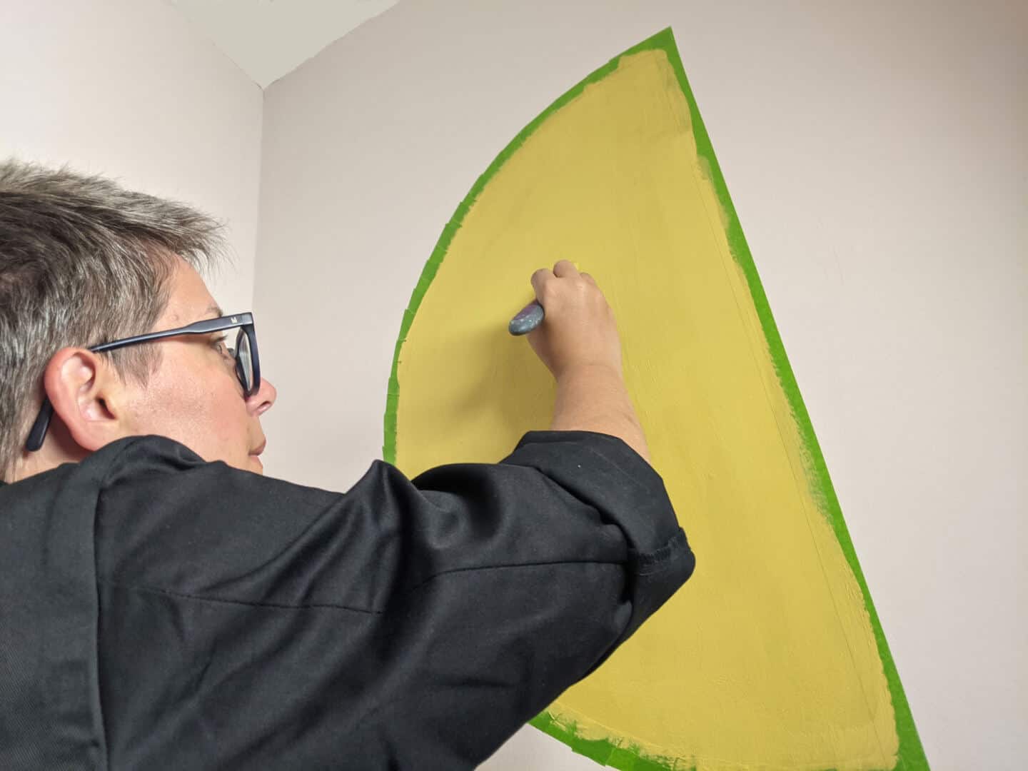 Once you have painted your shapes and you’re sure that you’ve not left any areas a bit patchy, it’s time to remove the tape. Do not wait for the paint to dry completely. It helps to get a crisper finish if you remove the tape when the paint is still wet. But this does mean you need to make sure you have good coverage before taking it off as it will be trickier to repaint once the tape has been removed.