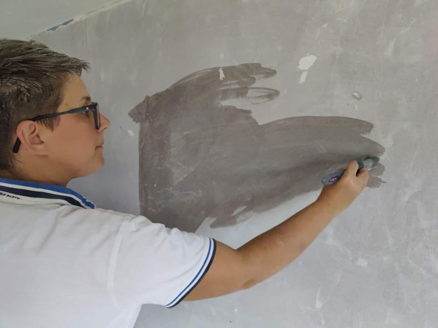 As the paint was flaking off the wall, we had to do a bit of preparation before we could repaint. As we started to scrape and sand the flaking paint off, the whole lot came off, right back to the bare plaster. So we had to seal the wall using some watered down adhesive first. This was painted over the whole wall and then left to dry.