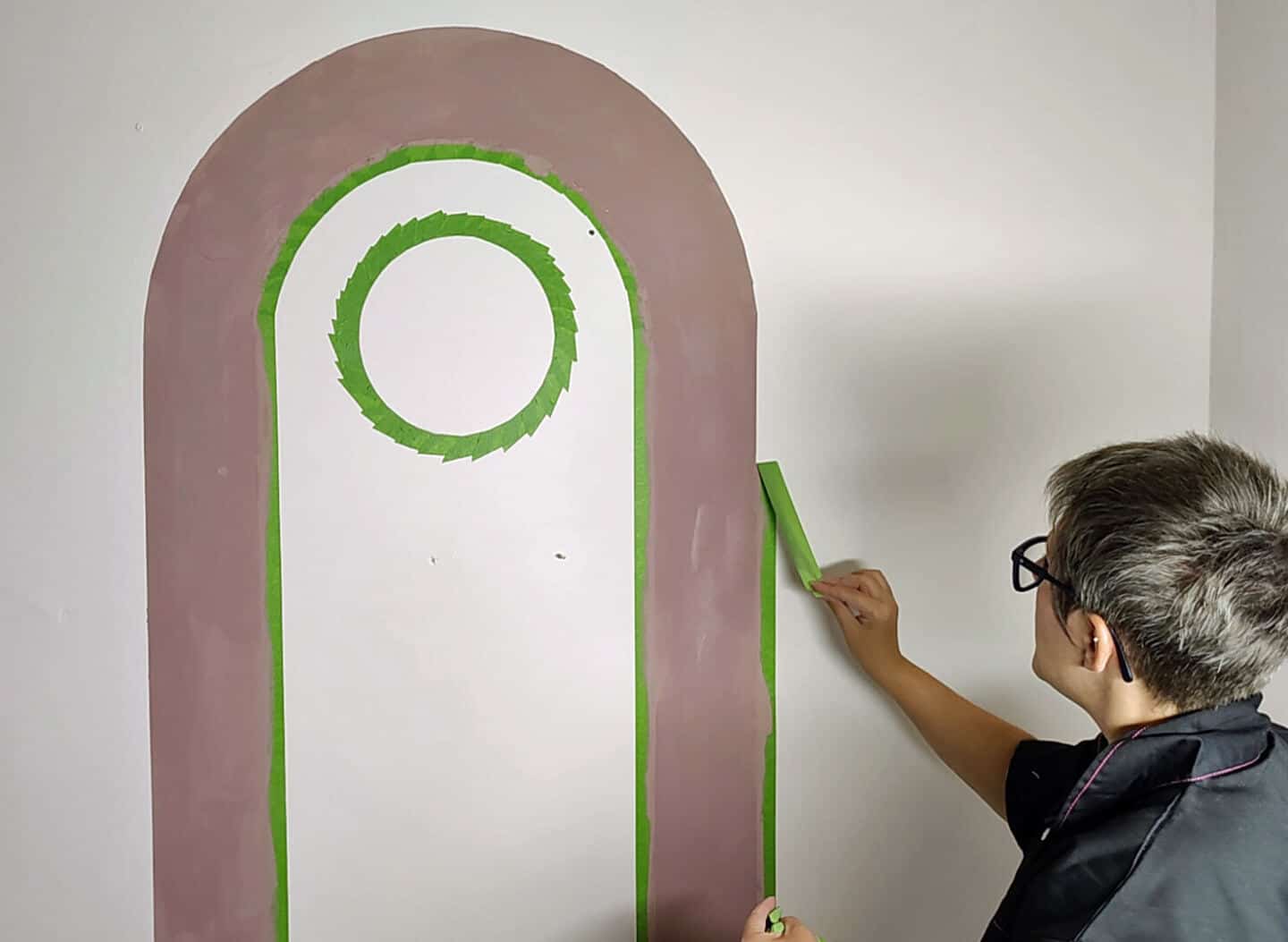 When it came to the curved lines of the arches and circles, I ripped small bits of tape off and overlapped them all the way around the curve. This way I was able to follow the line of the curve exactly and keep the tape flat against the wall whilst I went. It makes it slightly harder to remove but the finish is much crisper.