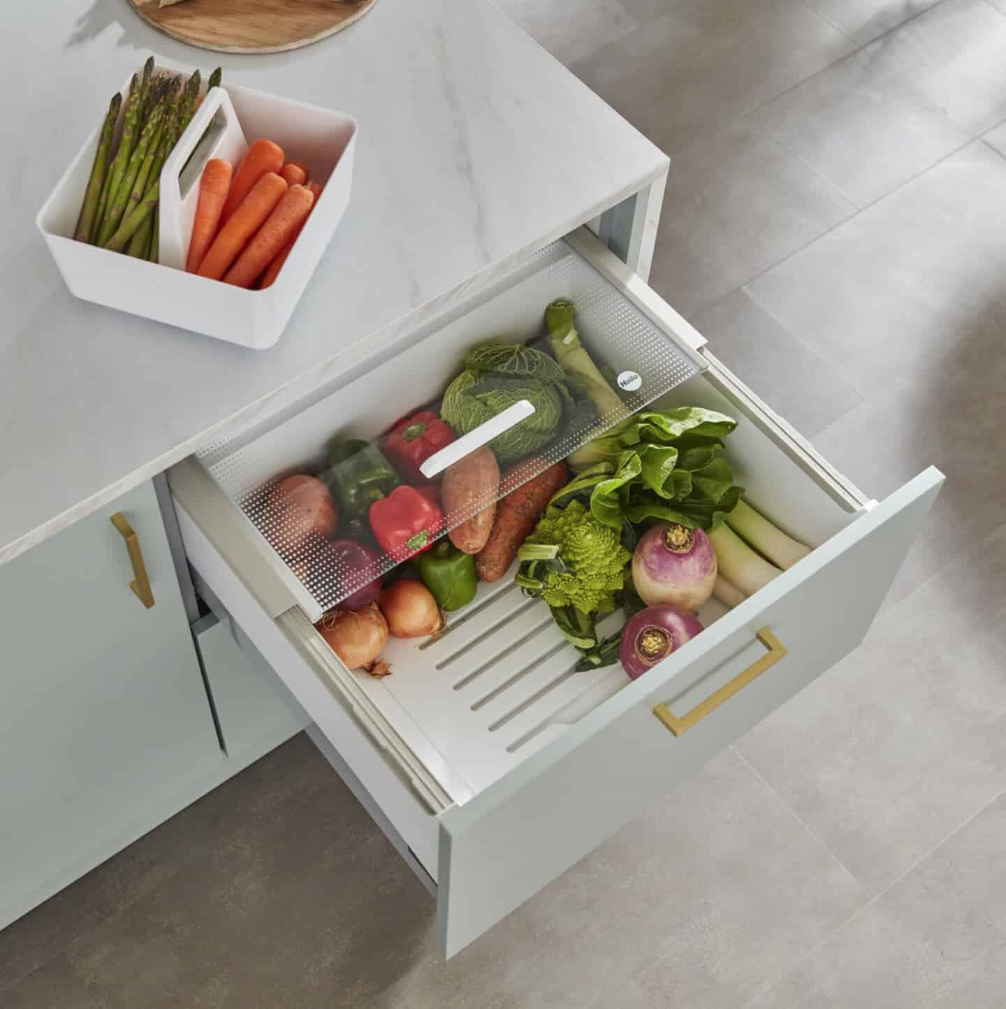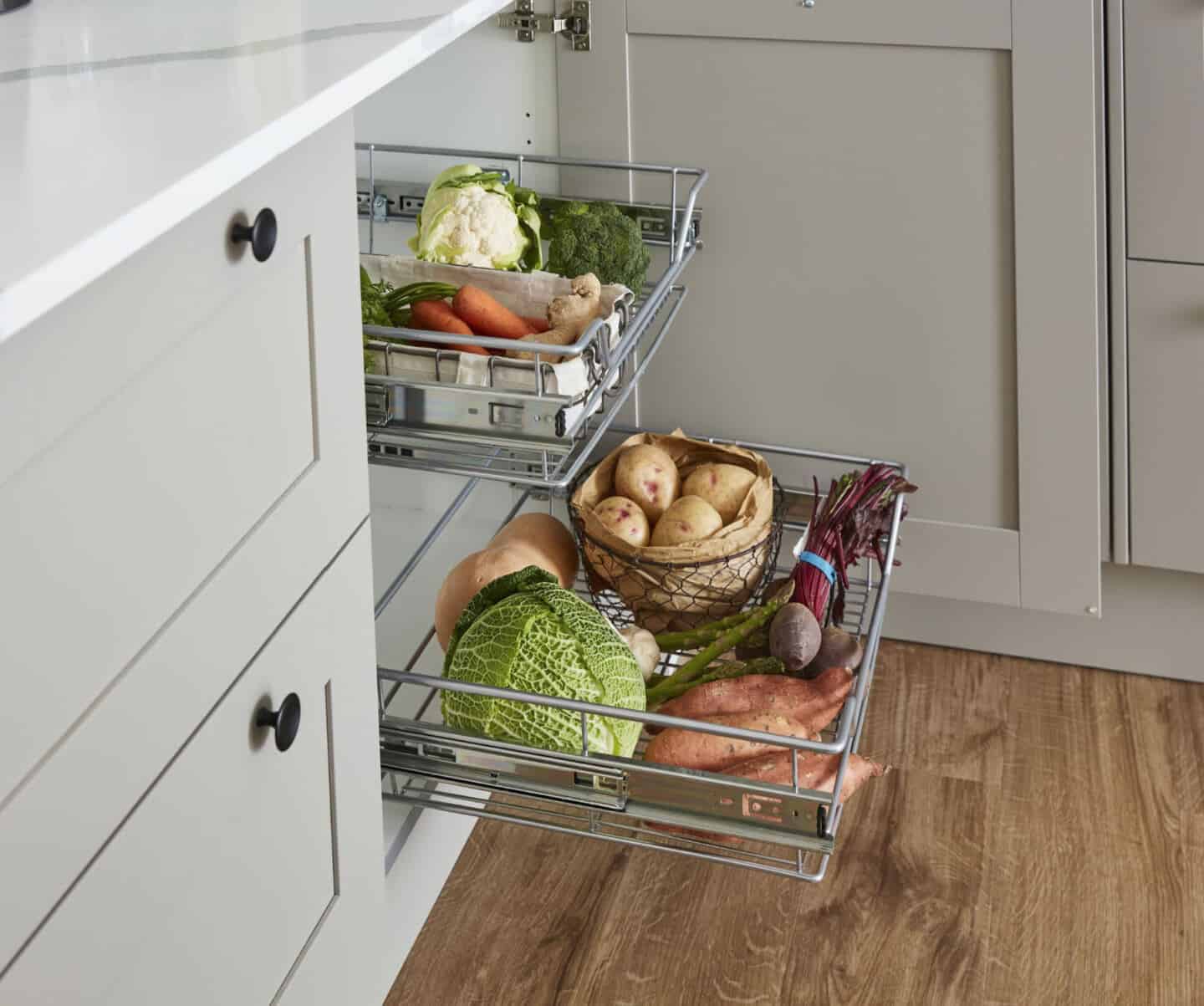 Storing fresh produce is an issue in my kitchen. We have no built-in storage other than the salad drawer in the fridge so we end up using some wooden crates to store vegetables. I’d much rather have them stored out of sight. Magnet offers a couple of solutions to this. Fresh produce can either be stored in a drawer or in wire basket drawers inside the base cabinets.