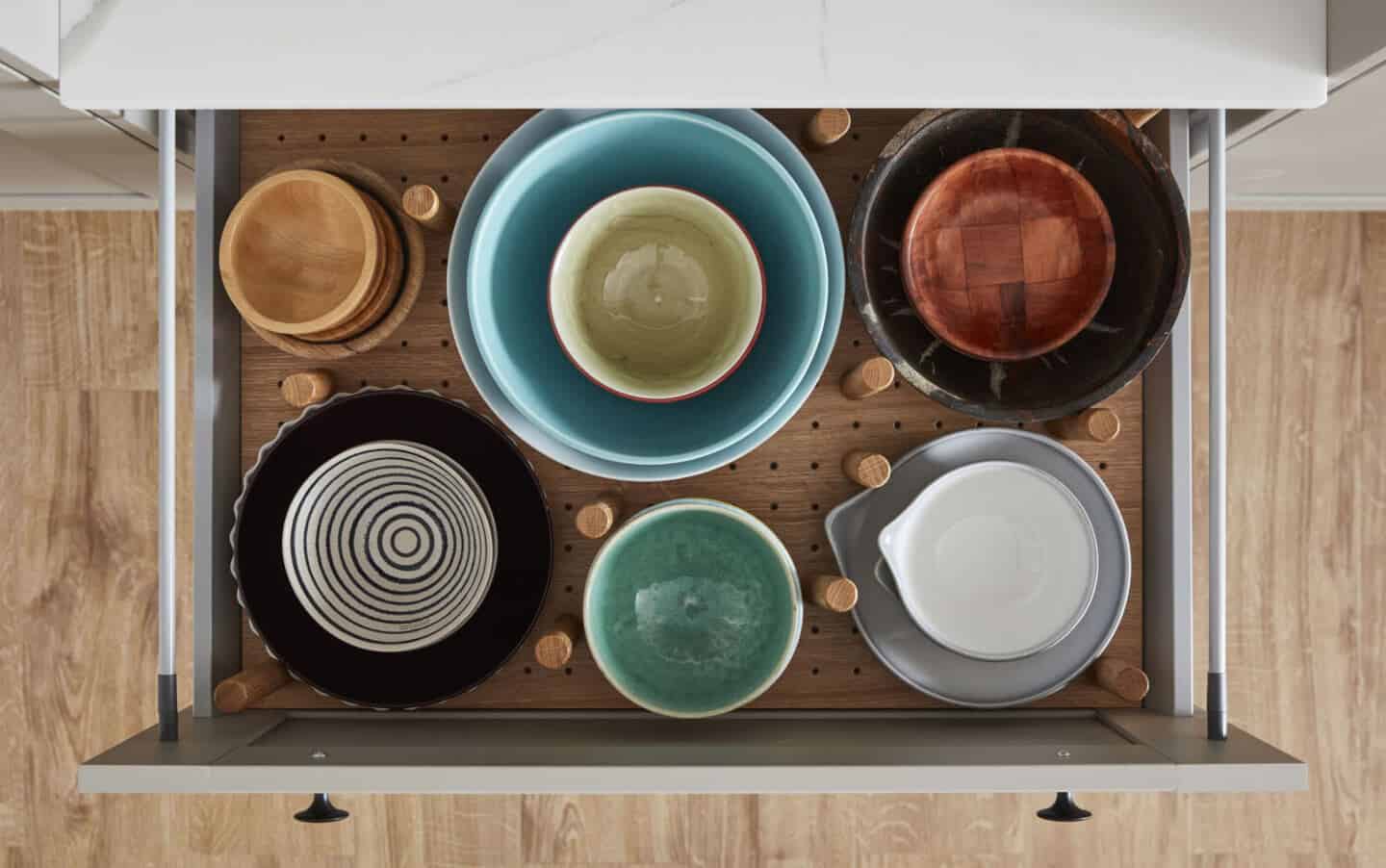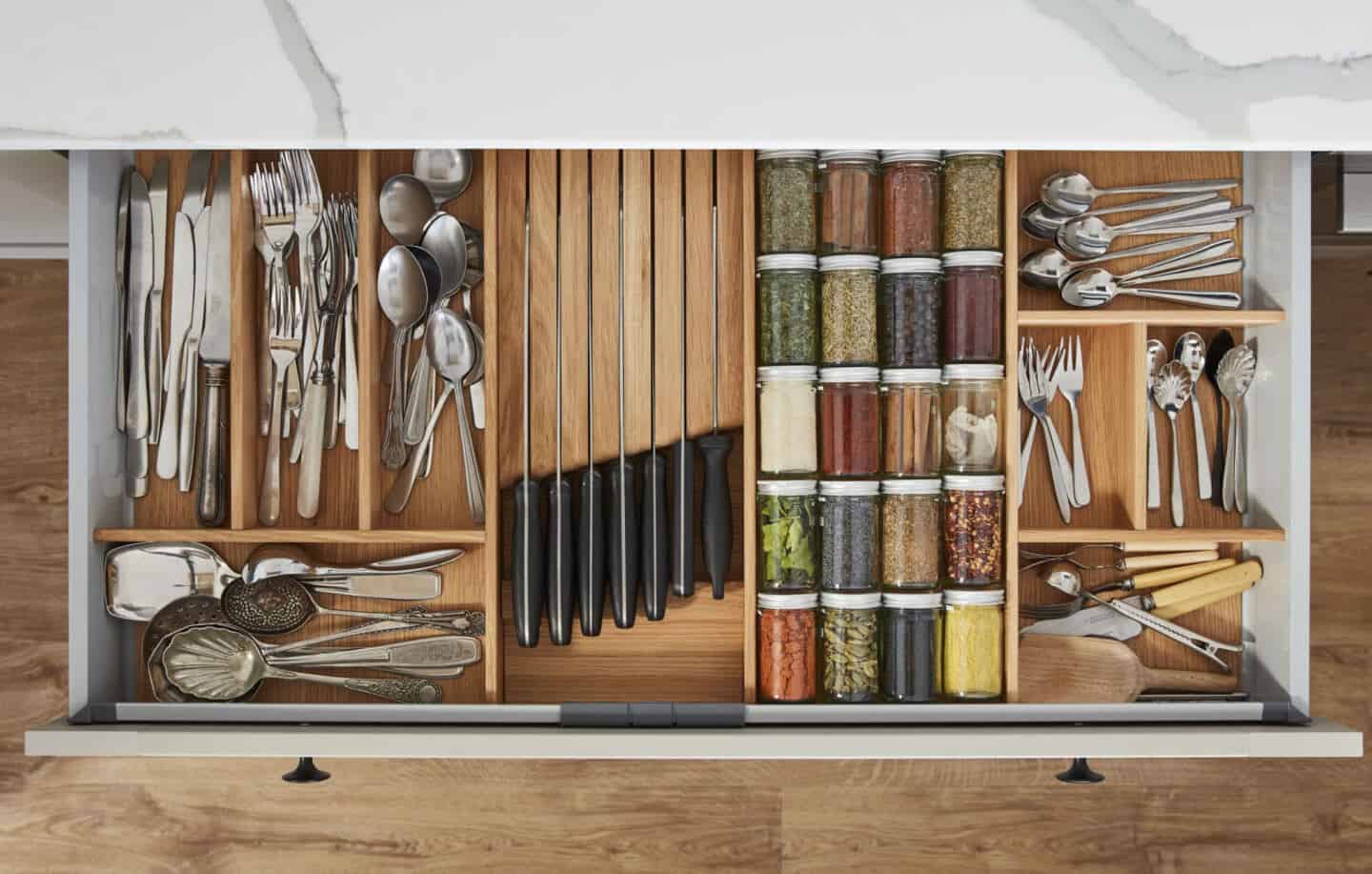 For me, this is one of the most important things when it comes to kitchen design. Yes, I want a kitchen that looks good, but I also want it to work hard for me and perform. Now, I’m not a chef, and I don’t really even like or enjoy cooking. That’s my husband’s realm. My role in the kitchen is the cleaning-up after he has created his delicious masterpieces. I load the dishwasher, clear everything away and wash it all down. So for me, it’s important that everything has a place and we can access it easily. I can’t stand cluttered surfaces or jam-packed chaotic cupboards.