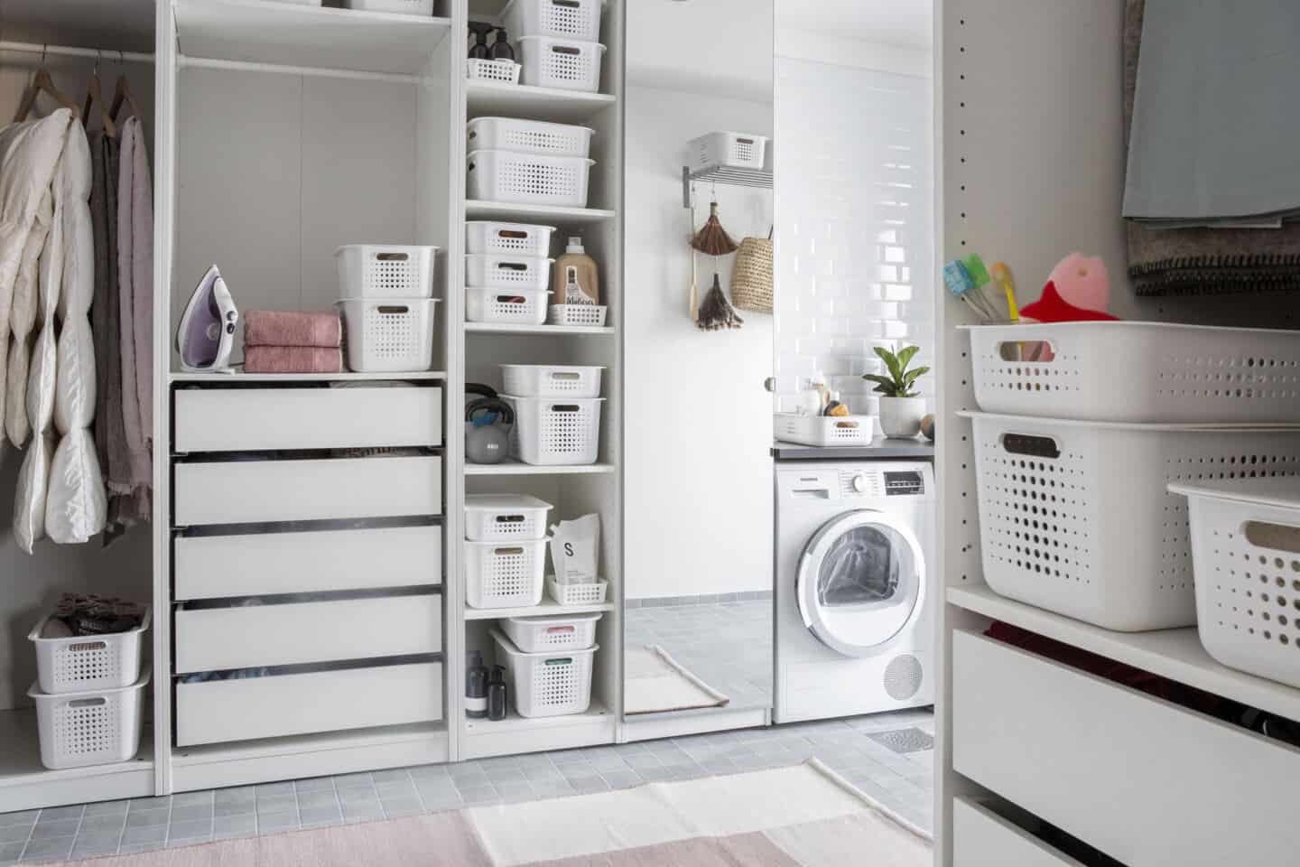 White plastic storage boxes in a laundry room. Image c/o Orthex Group