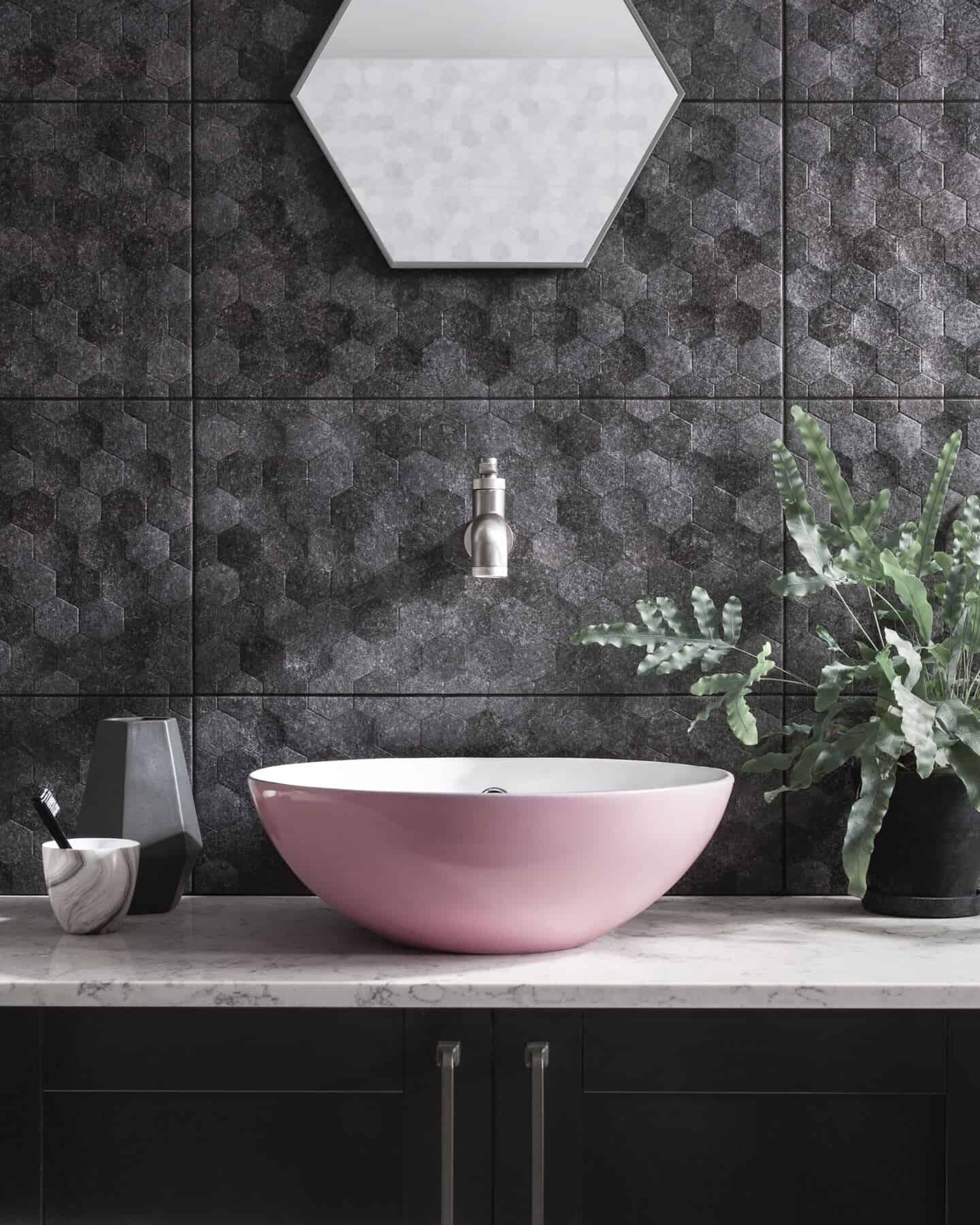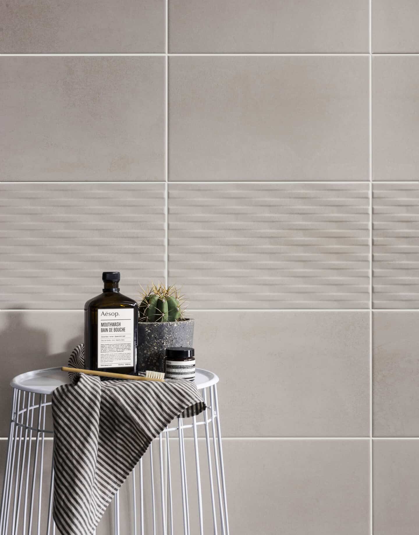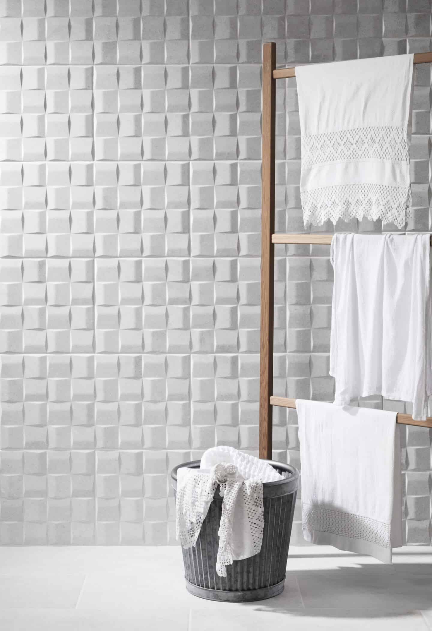 Textured wall tiles add depth and visual interest to the bathroom and make for a much more sensory experience. The selection seen here is from CTD Tiles