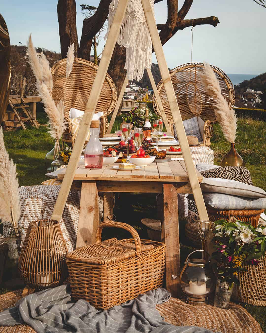 Beautiful boho picnic set up by The Natural Hire Company in the Grounds of Barrington House. Food by The Kitchen Table and Photography by Bite Something
