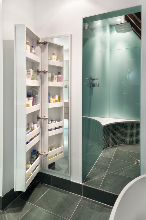 One important tip is to keep clutter to a minimum. Recessed mirror cabinets are always a good way of disguising your clutter. Everyone needs a mirror in their bathroom, and what better than a cabinet disguised as a mirror. You’ve then got the option of having a hidden electric point, adjustable shelves, or a toothbrush holder. Also try and integrate recesses in stud walls or offer storage over boxing for wall hung wc’s.
