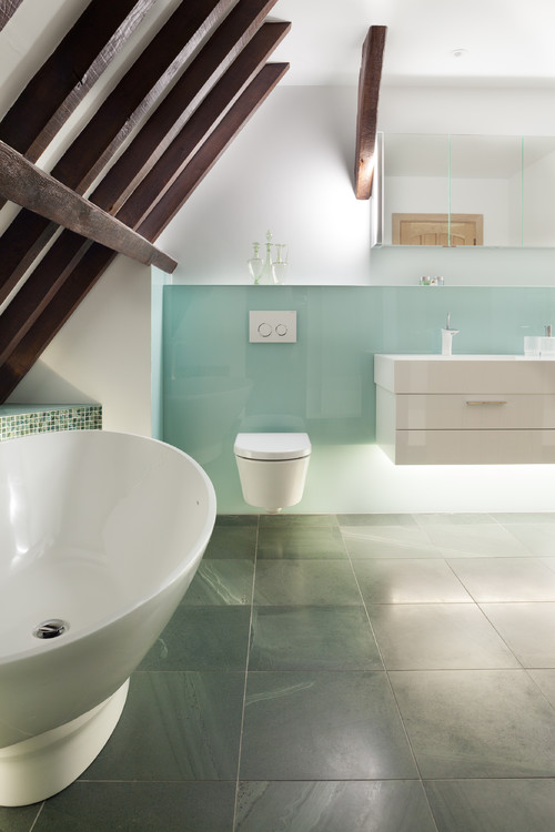 Use light coloured tiles on the walls and floor. If you must have different floor tiles keep the difference subtle and don’t use contrasting colours. Using the same tiles for floor and wall can create a seamless appearance, and open up the space. Large format tiles make a room feel more spacious as they have less grout lines and therefore look less busy. Larger tiles can also make the room look longer depending on how you place them.