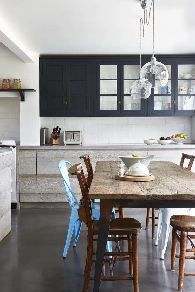 Contemporary two-toned cabinetry is a common thread for urban rustic kitchens. The most popular colour palette would appear to combine black, white and natural wood tones. However, for a slightly softer more Nordic look, soft greens, teal and purple can be used.
