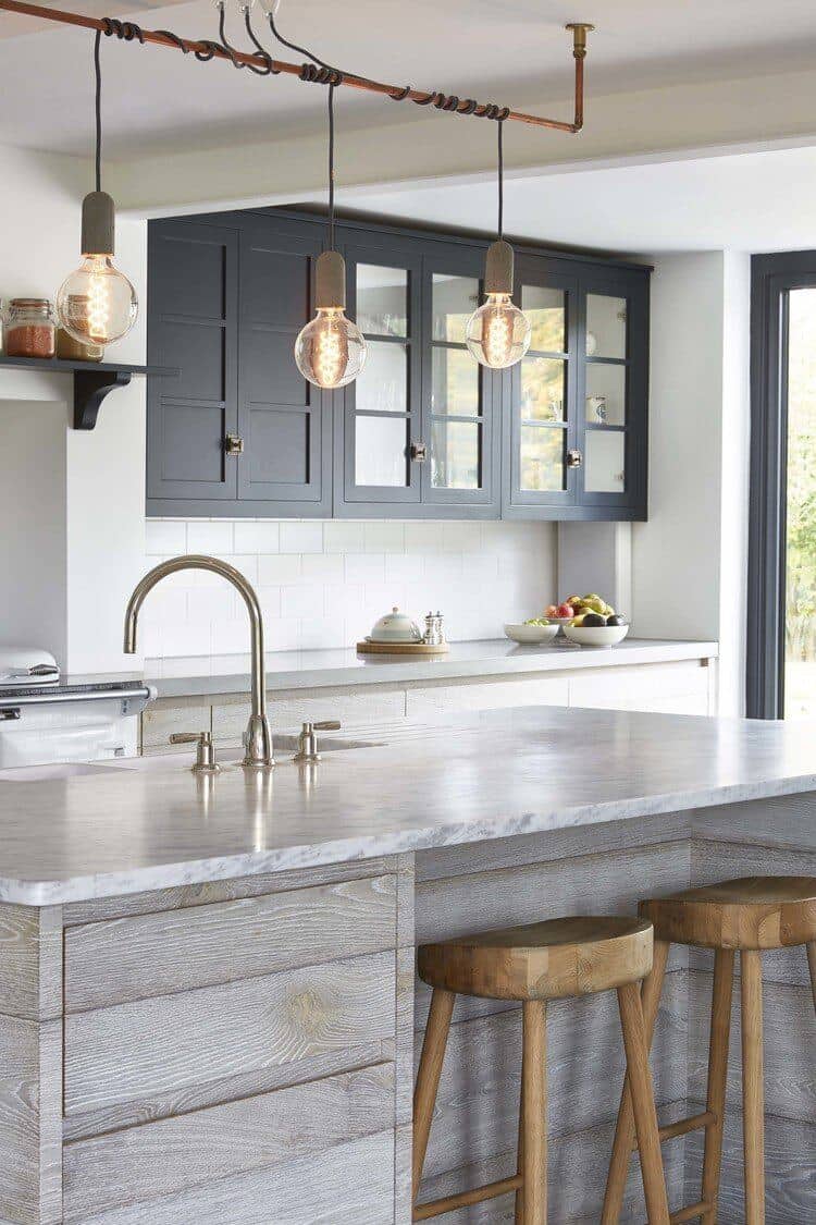 The textured woods add depth and homely charm to the kitchens whilst industrial-inspired accents add interest and character. Many of the urban rustic kitchens shown here feature industrial style lighting, either modern Edison-style bulbs suspended over kitchen islands or reclaimed factory pendant lights. For a less industrial, more understated look, glass pendants have been used.
