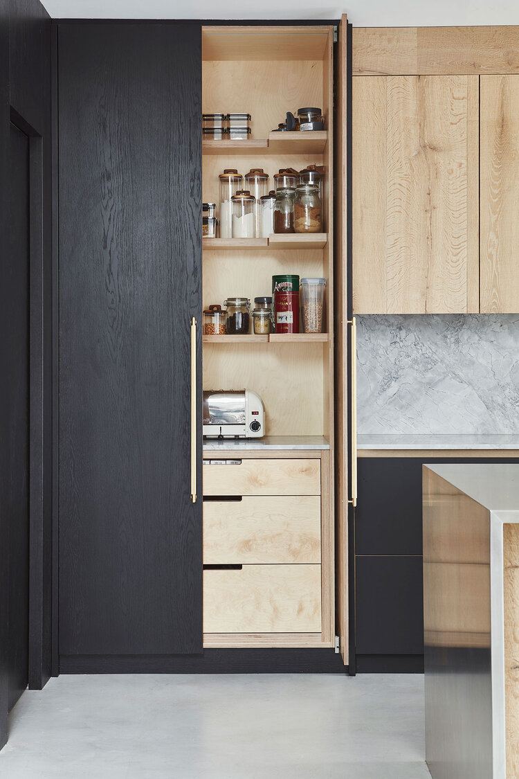 Copper is a popular industrial accent used either as a worksurface, or backsplash, for taps or as lighting conduit. For a more refined look brass has been used on door handles and lighting.