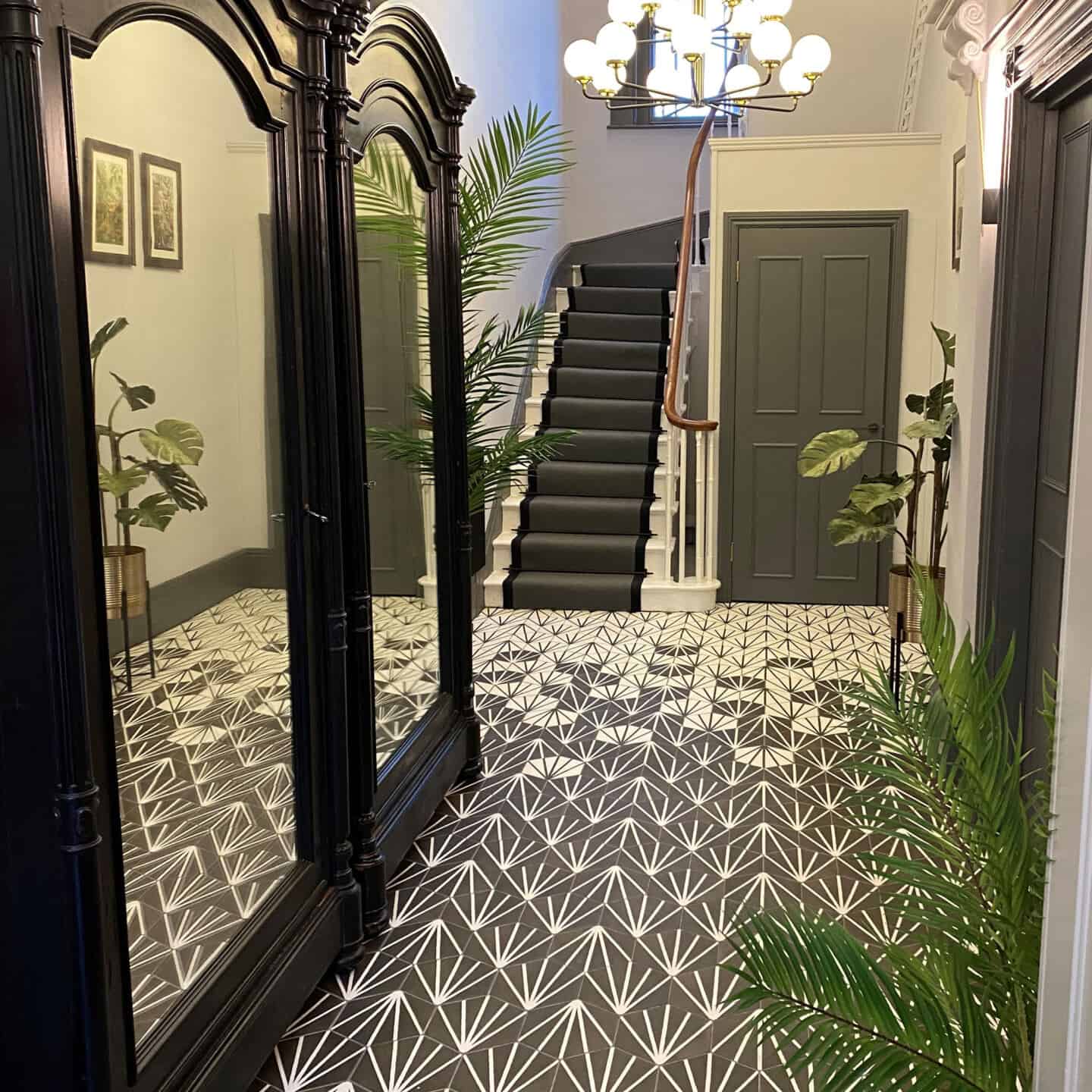 Floor tiles are a great way to add colour and pattern to the hallway. They work really well when it comes to narrow hallway design ideas because they can help to make a narrow space feel wider depending on the pattern that you choose. You should also consider the size of the tiles you choose. Larger format tiles will make the space feel larger, whereas smaller tiles may make it feel even smaller.