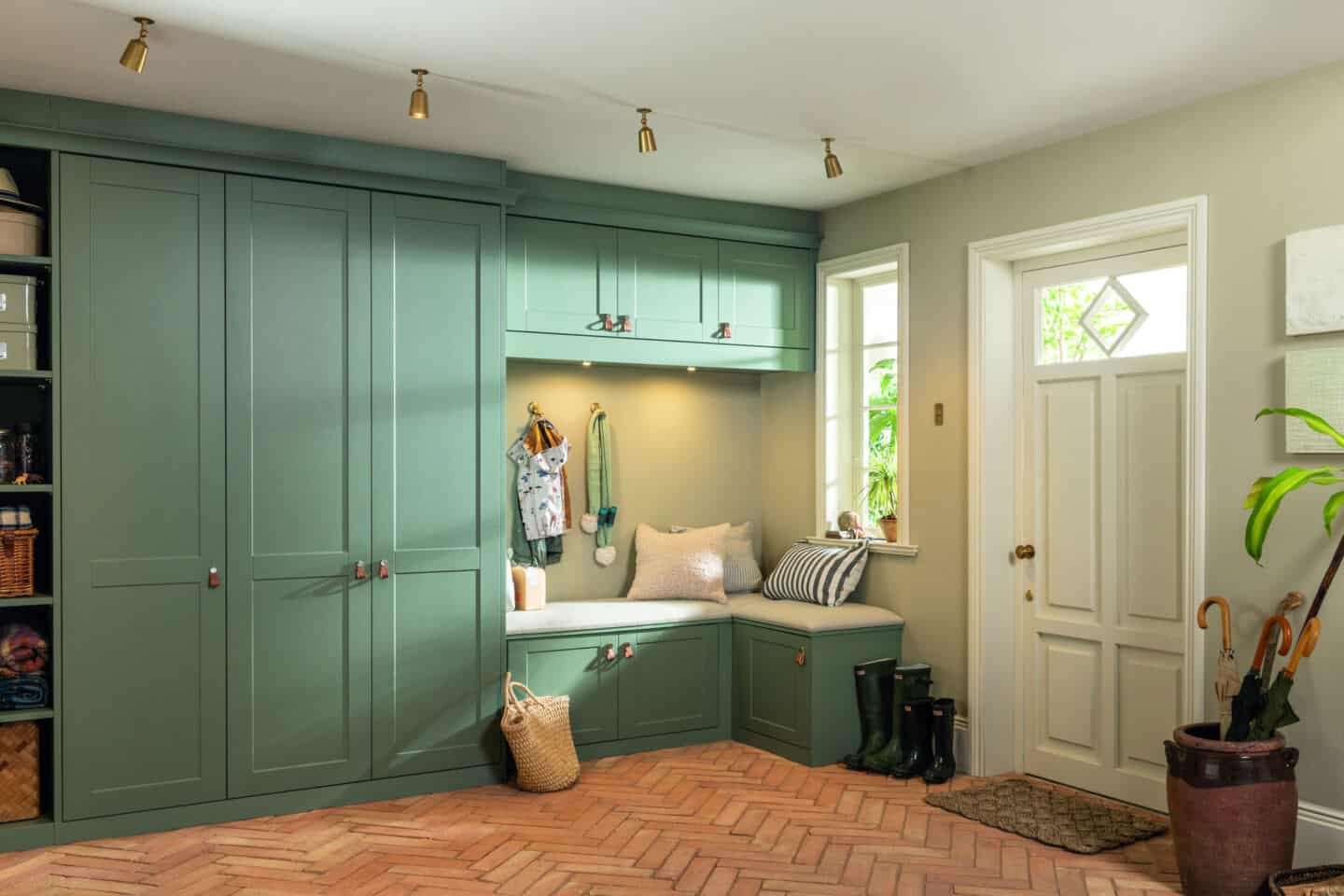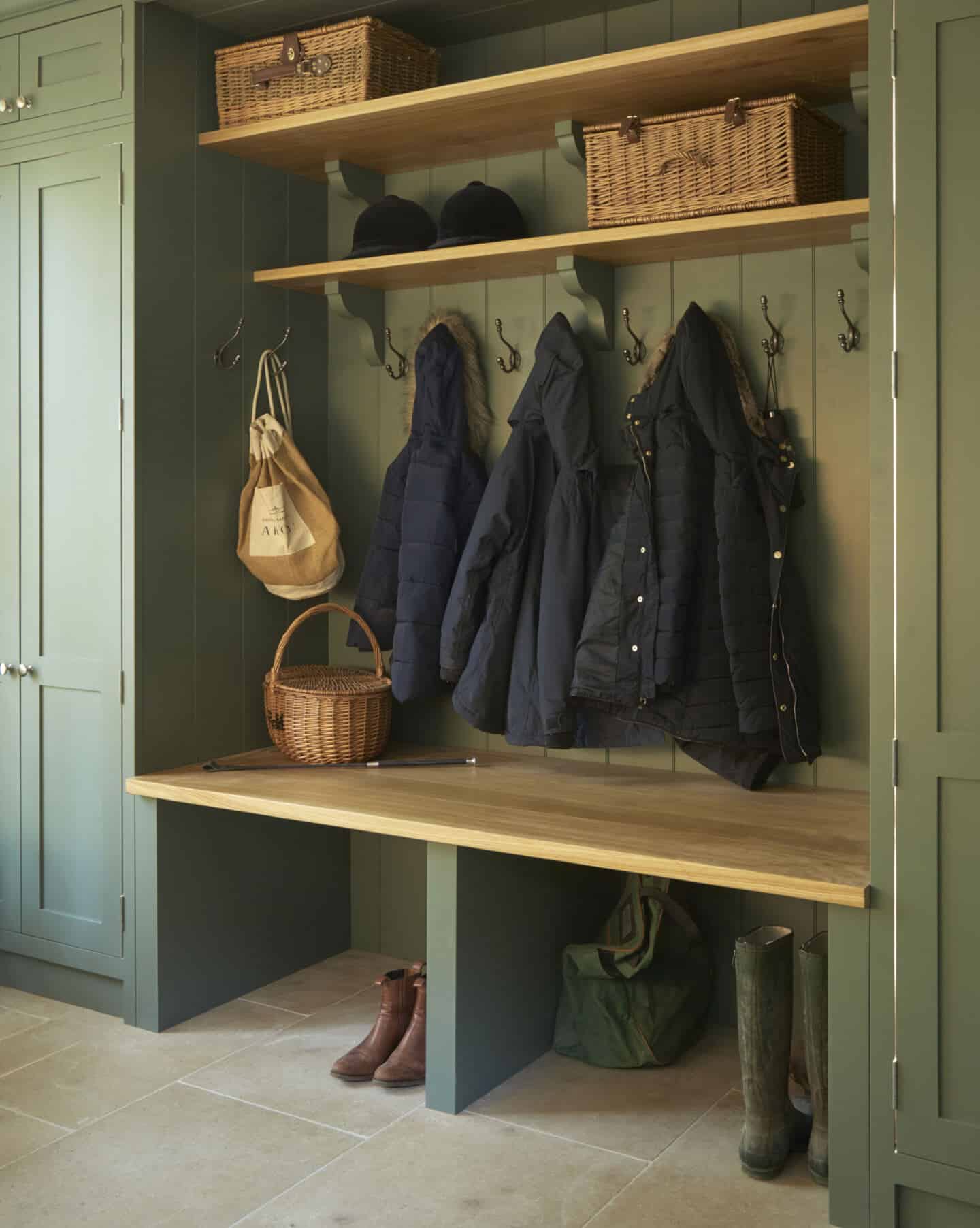 Built-in storage allows you to plan exactly how you will use the space. Hooks have enough clearance for coats. Shelves can be made to accommodate hats or storage baskets for all your winter woolies or summer caps. The bench can be fitted at a height that will allow for wellies beneath if necessary. Everything can be customised for your exact needs.